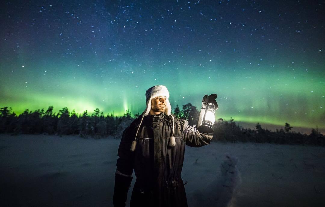 Fotoğrafta, başında beyaz kürklü bir şapka, üzerinde siyah mont, elinde fenerle gece karanlığında yürürken aurora borealis'i izleyen bir...