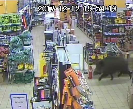 Fotoğrafta bir marketin içinde bir yaban domuzu görünüyor. Market rafları dolu ve bir sürü ürün var. Bu fotoğrafa bakarak yaban...