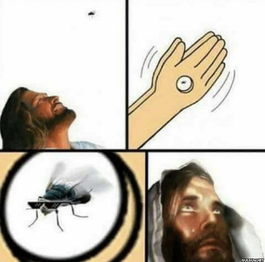 Bu fotoğraf, komik bir çizgi roman veya meme örneği. **Resimde:** * **Soldaki üst panelde:** İsa'nın gökyüzüne doğru baktığı,...