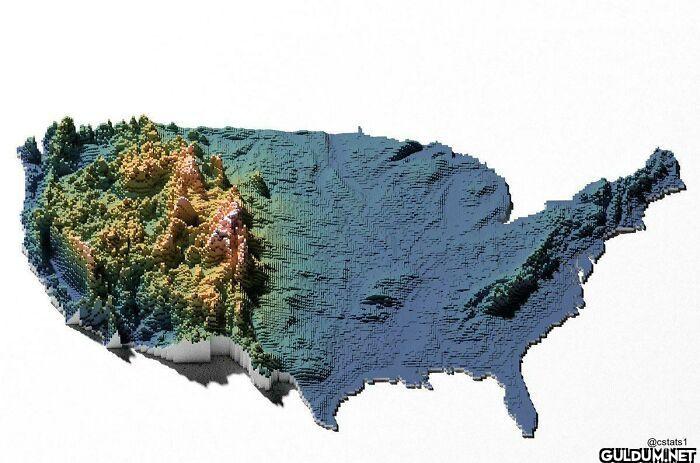 Resimde, Amerika Birleşik Devletleri'nin 3 boyutlu, piksel bazlı bir topografik haritası bulunuyor. Renkler, yükseklik farklılıklarını...