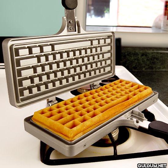 Resimde, klavyeyi andıran bir şekle sahip, metal bir waffle demirinin üzerinde, pişmiş bir waffle görülüyor. Waffle demirinin üst...