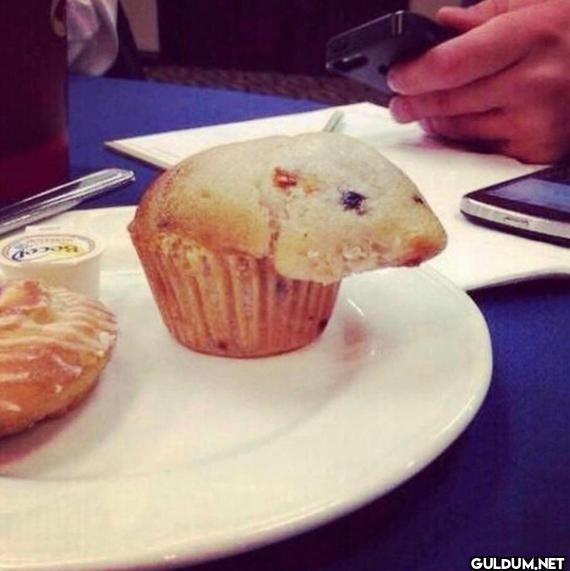 Fotoğrafta, bir masa üzerindeki beyaz bir tabağın içinde, yanık noktaları olan, kıvrımlı bir muffin görünüyor. Muffin'in şekli biraz...