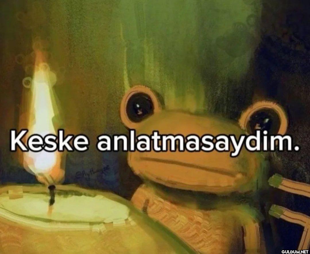 Fotoğrafta, bir mumun yanında oturan, şaşkın bakışlı bir kurbağa çizimi var. Kurbağanın üzerinde "Keşke anlatmasaydım" yazısı...