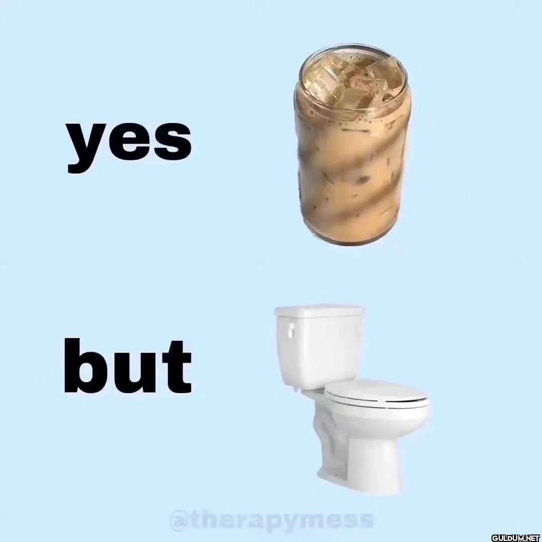 Görselde, "evet" yazısının yanında buzlu kahve dolu bir bardak, "ama" yazısının yanında ise bir tuvalet bulunuyor. Şaka, kahve içmenin...
