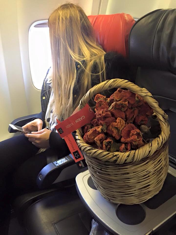 Resimde uçakta oturan uzun saçlı bir kadın, elinde telefonla oturuyor. Kadının yanında bir sepet içinde kızarmış biberler var. Bu...