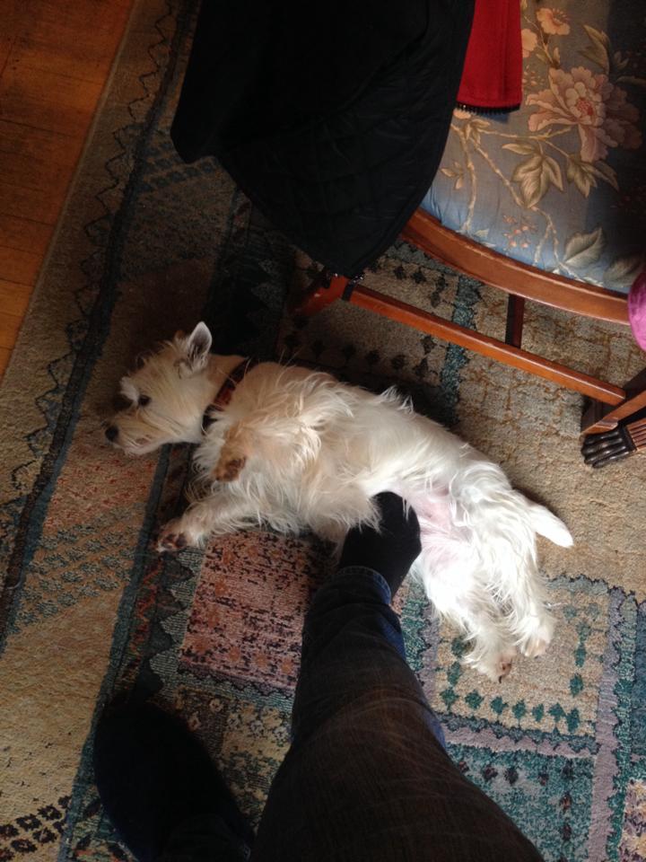 Fotoğrafta beyaz bir köpek, koltuğa oturmuş bir insanın bacaklarının üzerinde uzanmış şekilde görünüyor. Köpek rahatça dinlenirken,...