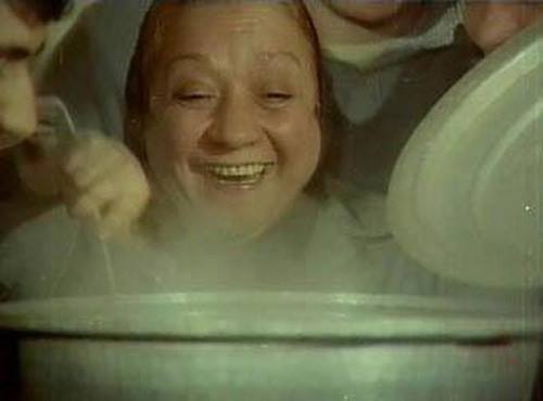 Resimde, yüzü gülümseyen ve ağzında gülümseyen bir kadın var. Kadının ağzına doğru bir kase çorba geliyor. Kadının sevinci, bu kase...