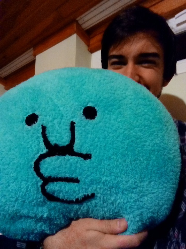 Fotoğrafta, yüzü mavi pelüş bir oyuncak tarafından gizlenmiş genç bir adam var. Pelüş oyuncak, "Oha" ifadesinin gözleri ve ağzı olan...