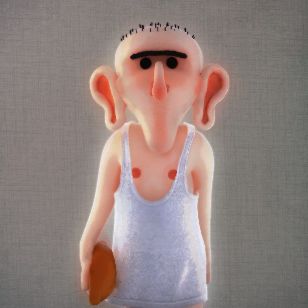 Resimde büyük kulaklara ve burnuna sahip, beyaz atlet giyen, ellerinde portakal tutan bir adam var. Şaka şu ki, adamın büyük burnu...