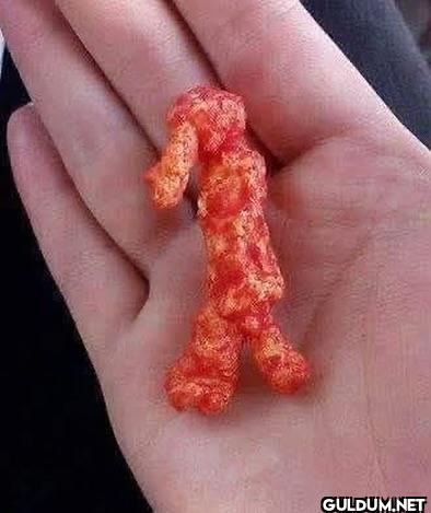 Fotoğrafta, elin içinde bir Cheetos (veya benzeri bir atıştırmalık) parçası görülüyor. Bu parça, insanı andıran bir figür gibi...