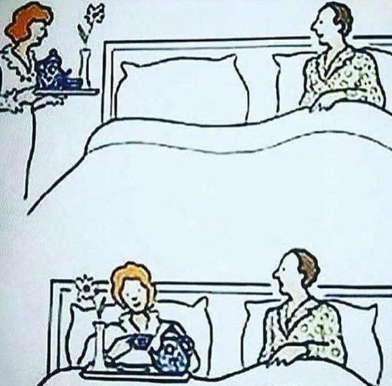 Resimde, yatakta iki farklı çift görülüyor. Üstte, erkek yatakta yatarak bir kadından bir bardak su istiyor. Altta ise, kadın yatakta...