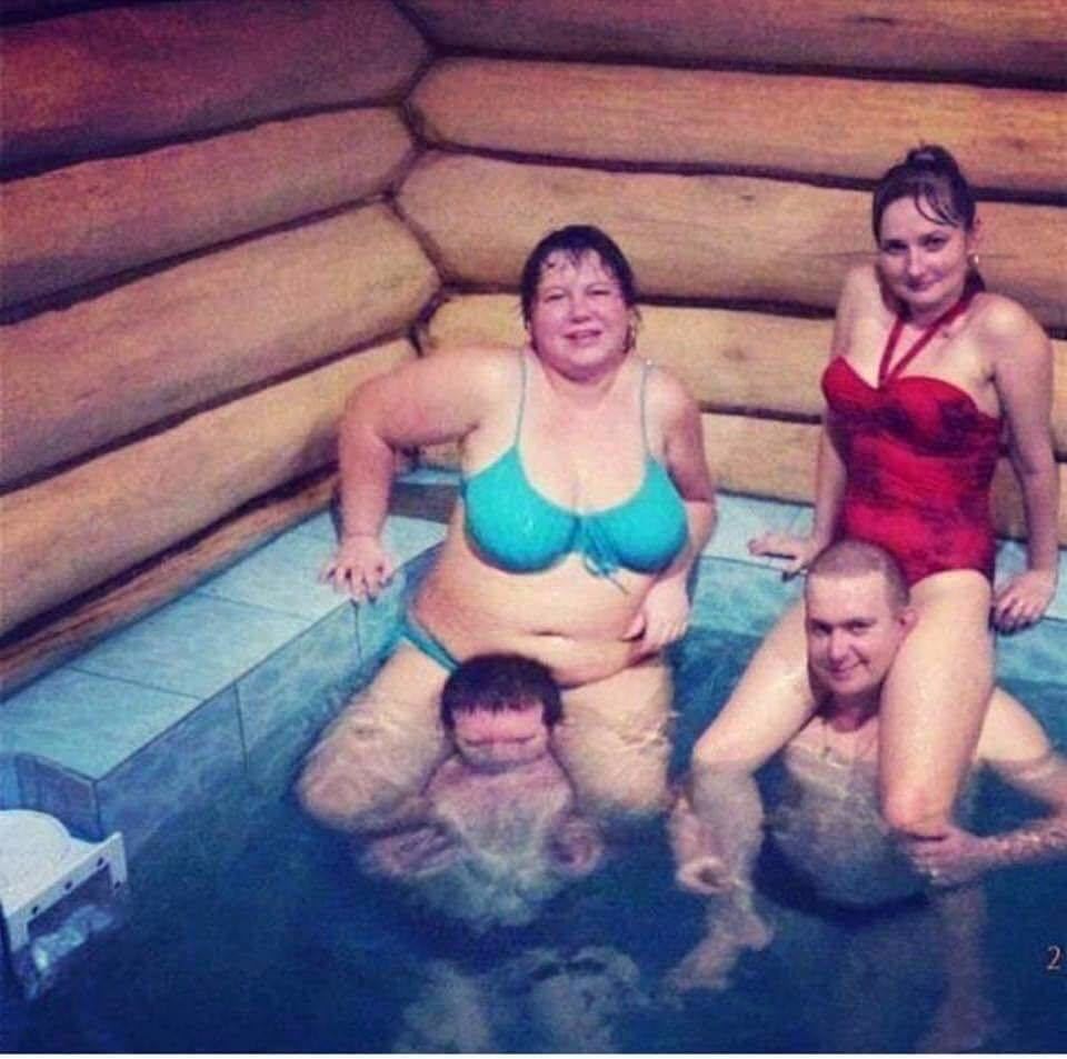 Fotoğrafta, bir yüzme havuzunda bir kadın ve üç erkek görüyoruz. Kadın, havuzun kenarında oturmuş ve ayakları havuzun içinde olan başka...