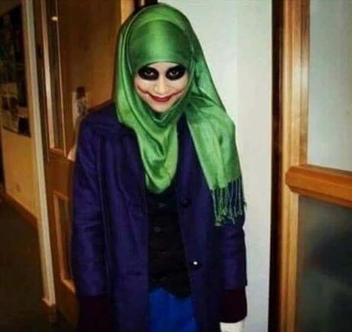 Fotoğrafta yeşil bir başörtüsü takmış ve joker makyajı yapmış bir kadın görünüyor. Joker kostümü giymiş ve şakaya yatkın bir halde...