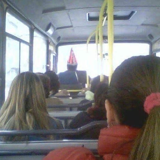 Fotoğrafta, bir otobüste oturan insanları görüyoruz. En önde oturan adamın başında şapka var ve otobüsün arka tarafında oturan bir...