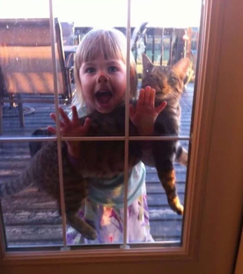 Resimde bir kız çocuğu ve kedisi pencerenin arkasında duruyor. Kız çocuğu dışarıya bakıyor ve kedi onun elini tutuyor. Kız çocuğunun...
