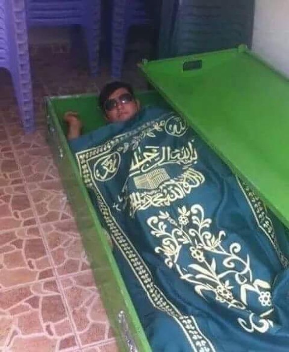 Fotoğrafta yeşil bir tabutun üzerinde yatmış bir adam görülüyor. Tabutun üzerine sarılı yeşil bir bezde Arapça yazılar var. Adamın...