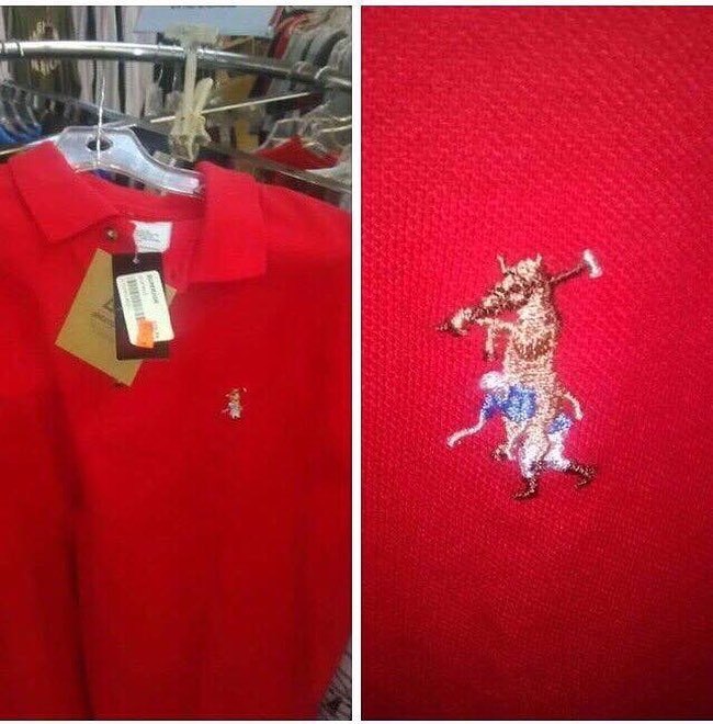 Fotoğrafta kırmızı bir polo tişört var. Tişörtün üzerinde "Polo" markasının logosu olan bir atlı binici resmi bulunuyor. Ancak logo...