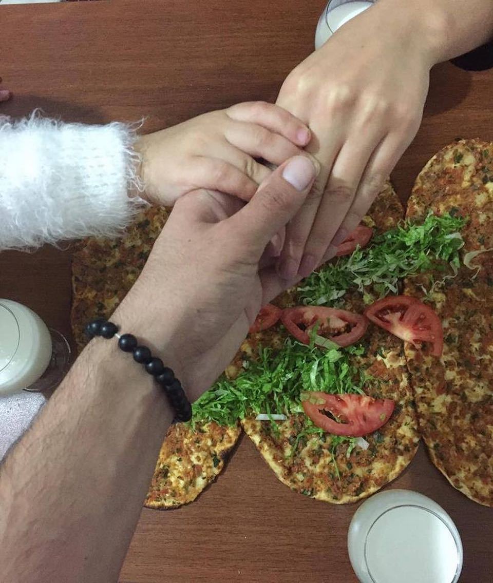 Resimde üç kişi ellerini birleştirmiş, bir kişinin bileğinde siyah boncuklu bileklik var. Önlerinde üç adet lahmacun ve iki bardak ayran...