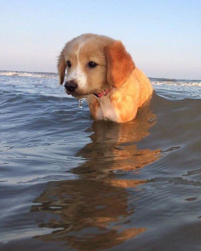 Resimde suda yüzmekte olan sevimli bir köpek yavrusu var. Köpeğin yüzünde "Ben bu suda yüzmeyi öğrenmeye çalışıyorum ama sanki hiç...