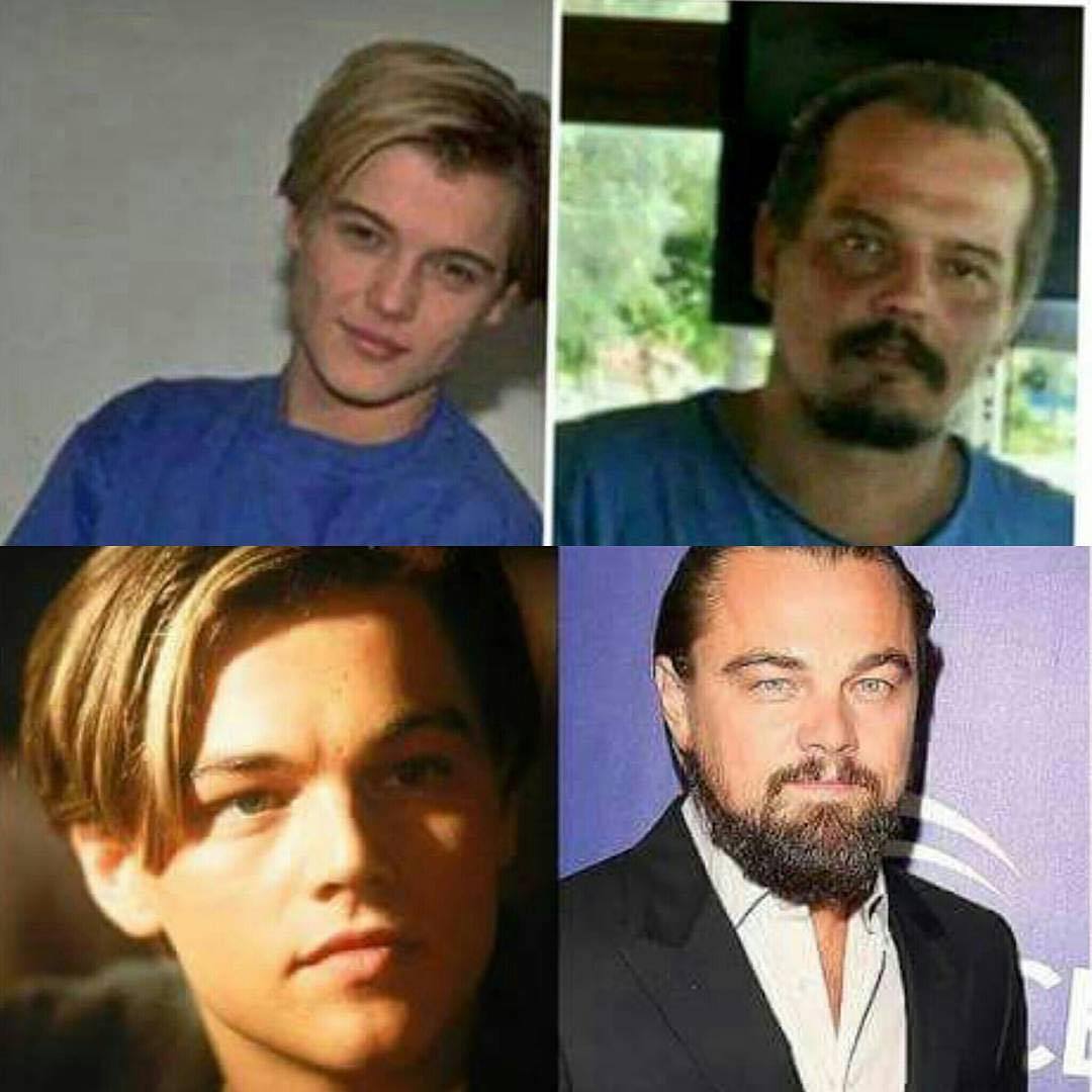 Resimde dört farklı fotoğraf bulunuyor. Üstte solda genç Leonardo DiCaprio, üstte sağda yetişkin Leonardo DiCaprio, altta solda genç...