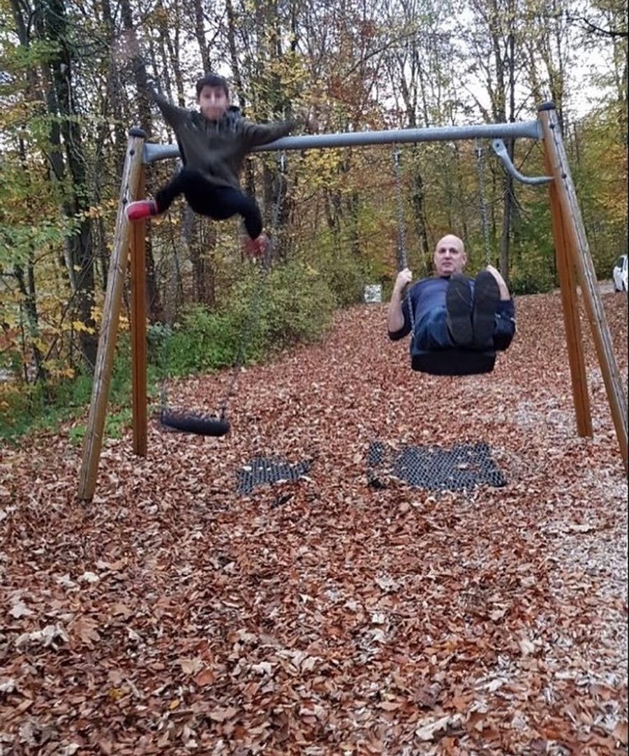 Resimde iki adam salıncakta görünüyor. Sağdaki adam salıncağa oturmuş ve yüzü gülüyor. Soldaki adam ise salıncakta uçuyormuş gibi...