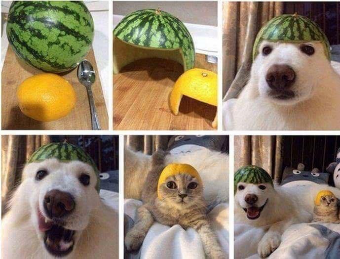 Bu fotoğrafta, karpuzların hayvanların başına takılıp giysi gibi kullanıldığı komik bir durum gösteriliyor. Karpuzların şekli, başın...