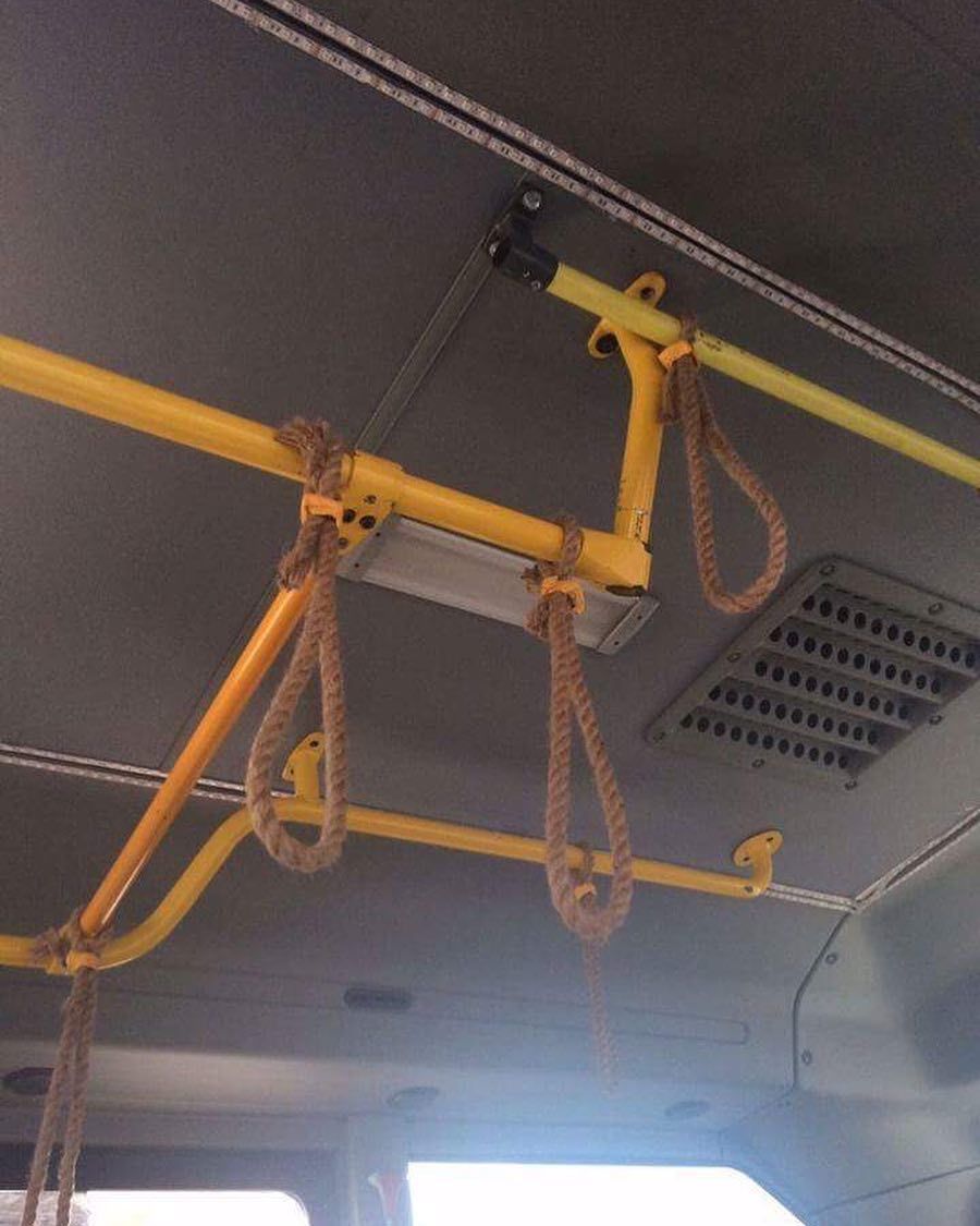 Fotoğrafta bir otobüsün içi görünüyor. Otobüsün tavanından sarkıtılmış, yolcuların tutunması için kullanılan sarı renkli direklerden ve...