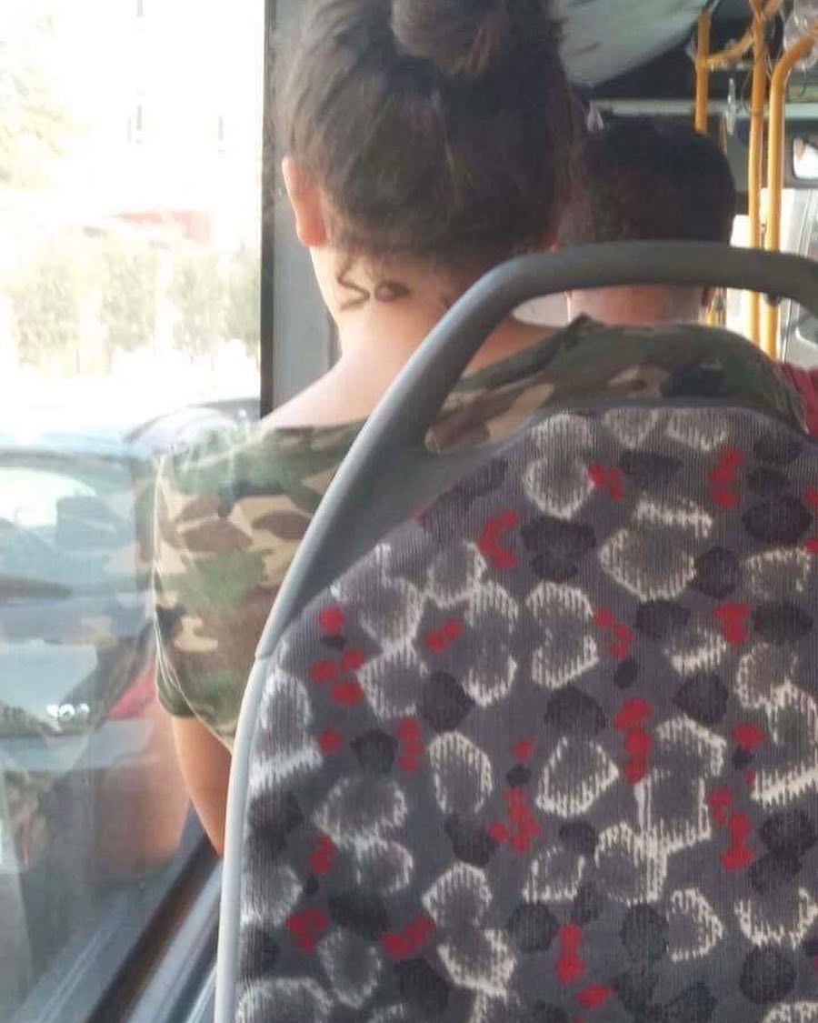 Fotoğrafta bir otobüste oturan bir kadının boynunda "SO" yazan bir dövme var. Şaka ise kadının boynundaki dövmenin, otobüs koltuğunun...