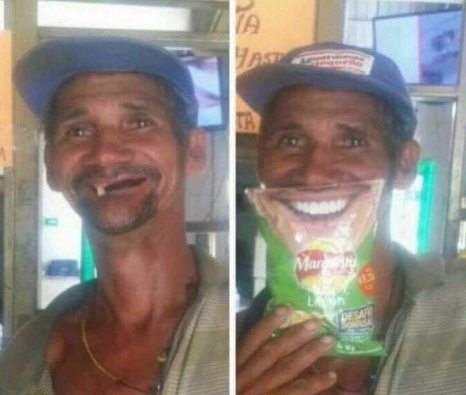 Fotoğrafta iki adam var. Sol taraftaki adamın dişleri eksik, sağ taraftaki adamın ise çenesine yapıştırılmış büyük bir patates cipsi...