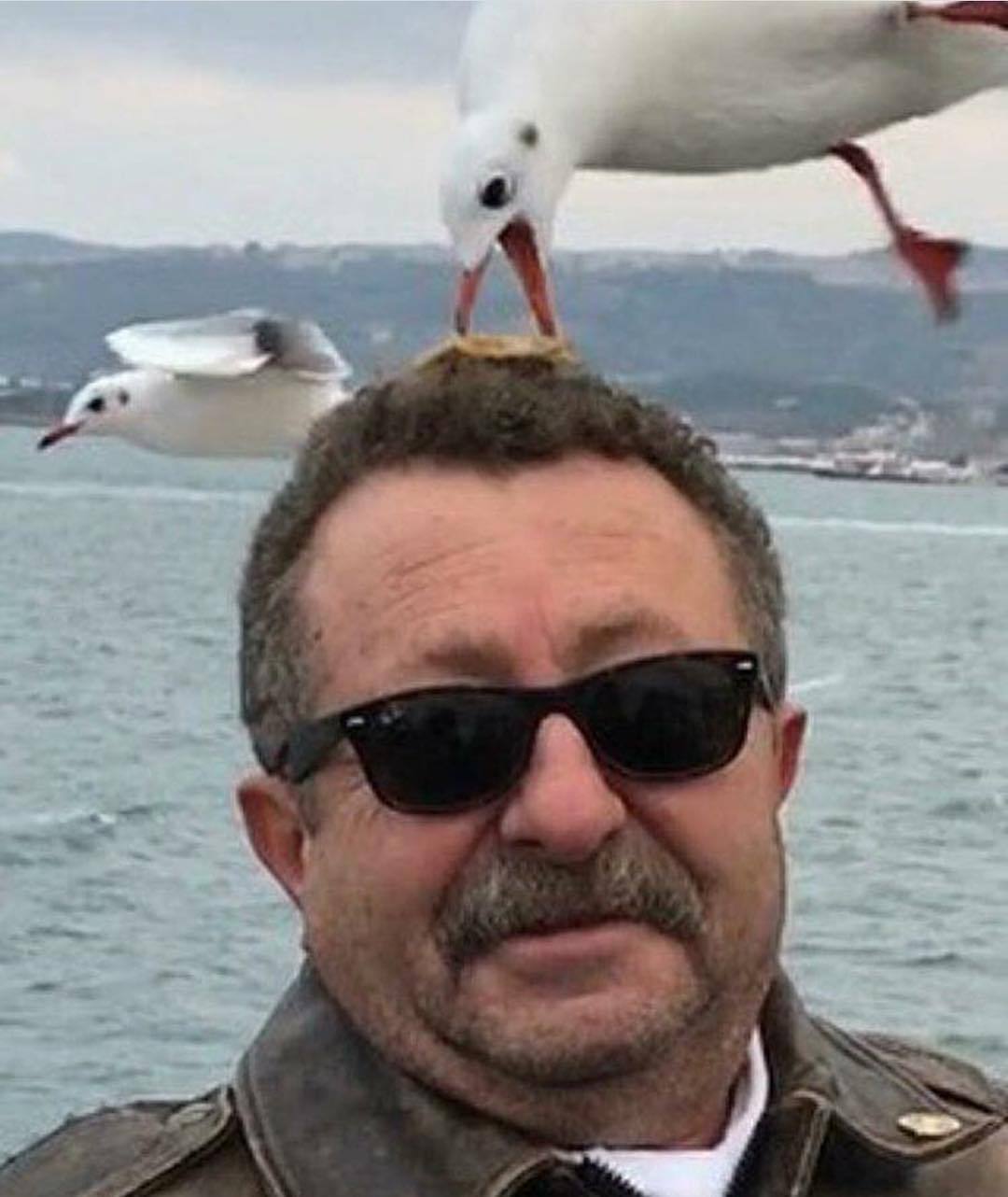 Fotoğrafta, başında martı olan bir adam görünüyor. Martı adamın başında bir şeyler yediği anlaşılıyor. Martı, adamın kafasına tünedikten...