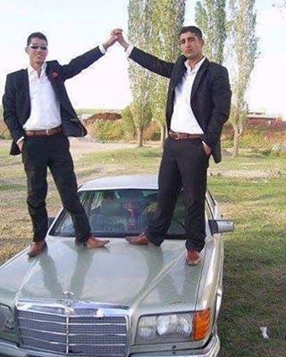 Fotoğrafta iki erkek var. Soldaki, "İbrahim Büyükak" adlı bir Türk komedyeninin fotoğrafına benzeyen, gülünç bir yüz ifadesi ile siyah...