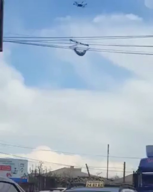 Fotoğrafta bir drone, elektrik tellerine takılmış durumda. Bu, drone'un "elektrik tellerine takılma" gibi yaygın sorunlarla...