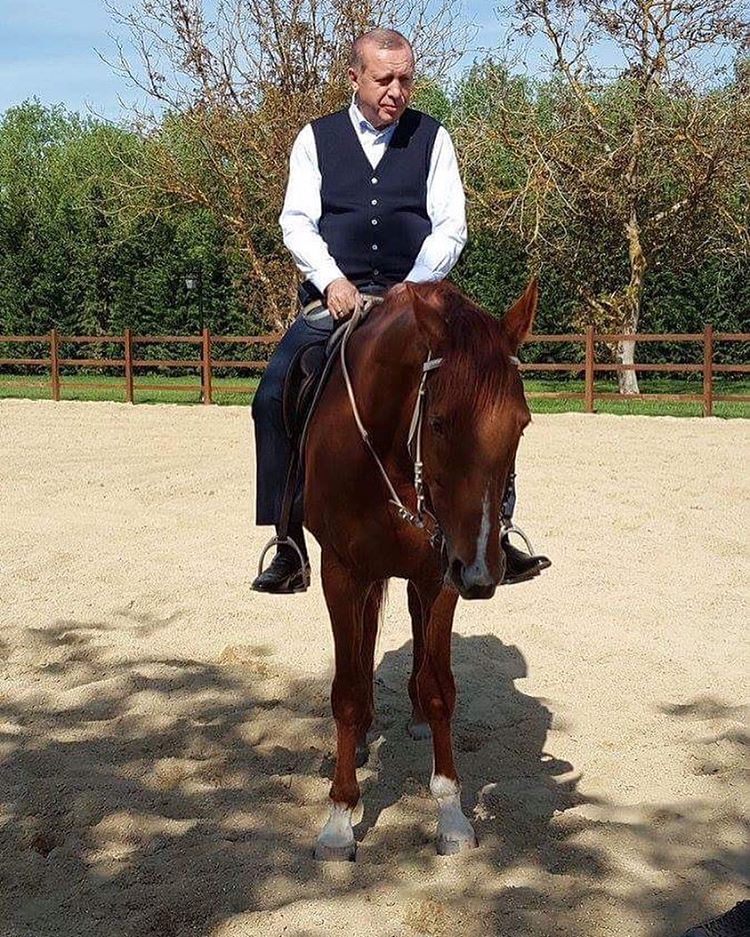Fotoğrafta Recep Tayyip Erdoğan at üzerinde binmiş şekilde görünüyor. Atın adı "Tayyip" ve Erdoğan'ın atın üzerinde durduğu pozisyondan...