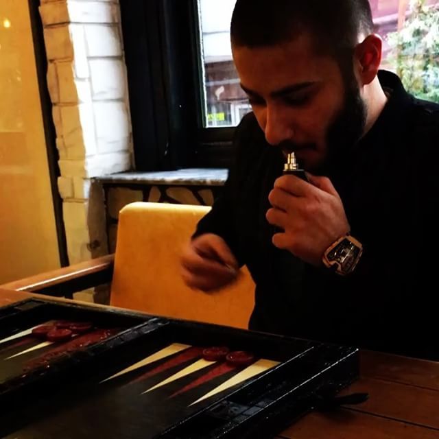 Fotoğrafta, masada bir oyun tahtası olan, yanında oturaklı bir koltuk bulunan ve bir adamın elinde parfüm şişesiyle durduğu bir mekan...