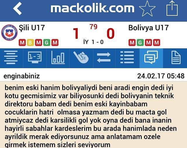 Fotoğraf, Şili ve Bolivya'nın U17 takımları arasındaki bir futbol maçının skorunu gösteren bir internet sitesinden bir ekran...