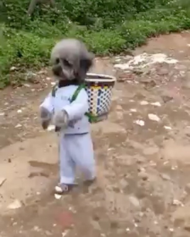 Fotoğrafta sevimli bir köpeğin sırtında sepetle yürürken görülüyor. Köpeğin sepet taşıyor olması ve sepetin üzerinde "Teslimat" yazıyor...