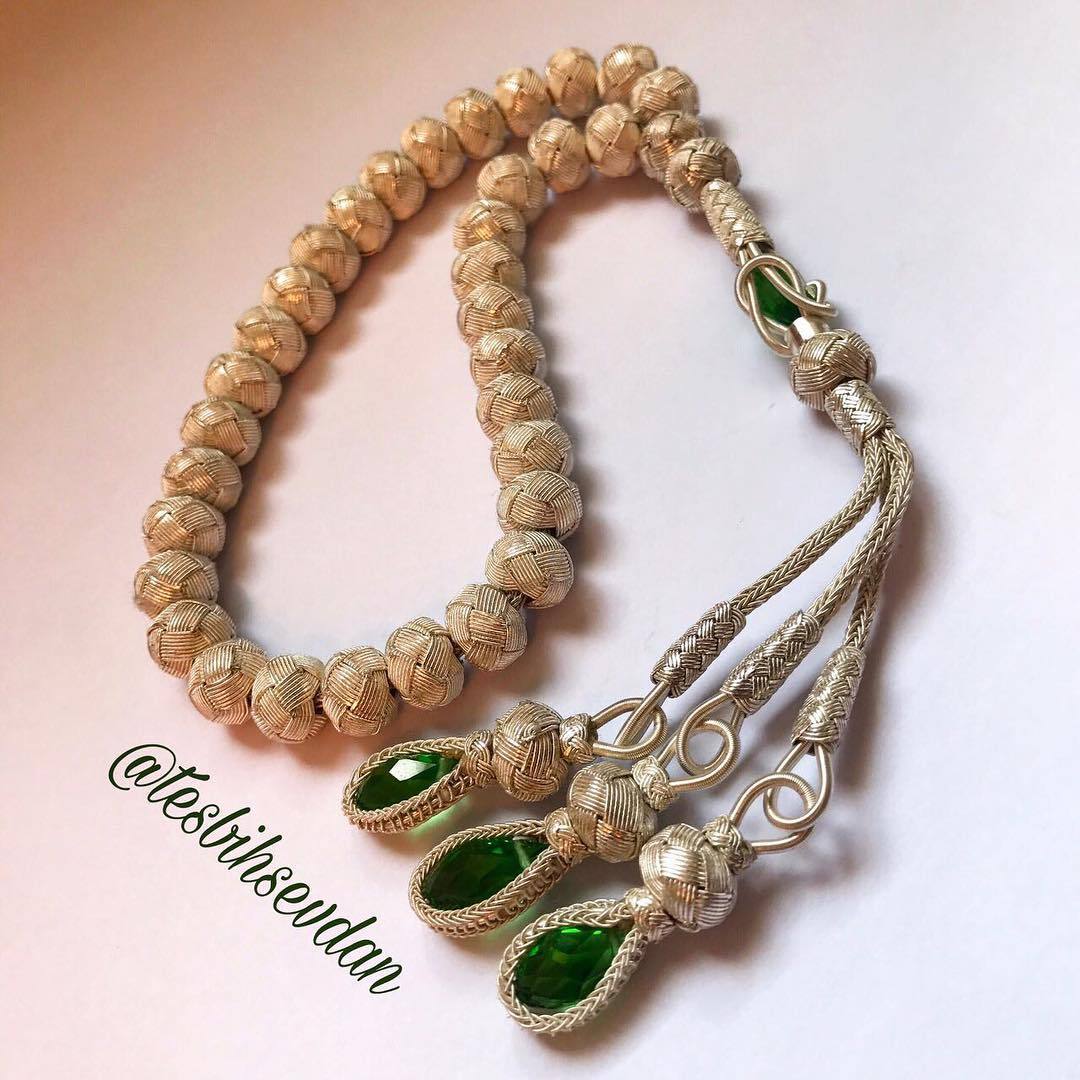 Resimde gümüşten yapılmış tespih görünüyor. Tespihin ucunda yeşil taşlar bulunuyor. Bu tespih "ateşten" yapıldığı için "ateş tespihi"...