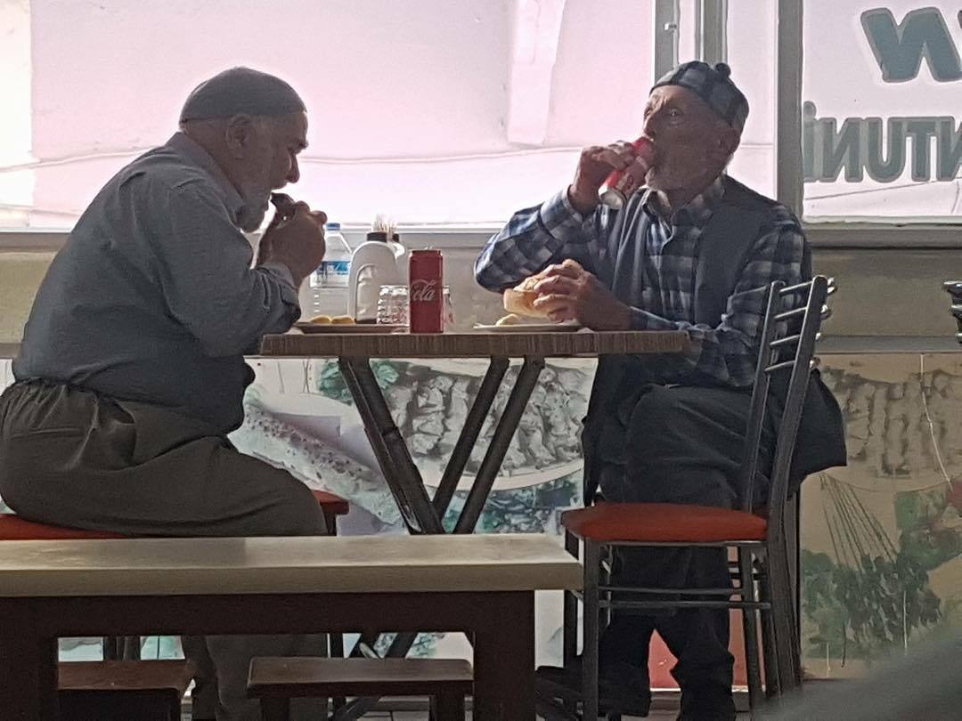 Fotoğrafta iki yaşlı adamın bir masada oturup yemek yediği görülüyor. Soldaki adam diğer adama "Senin neyin eksik?" diye soruyor....