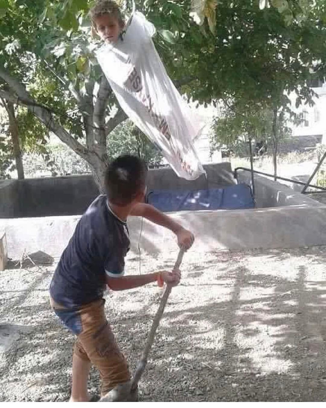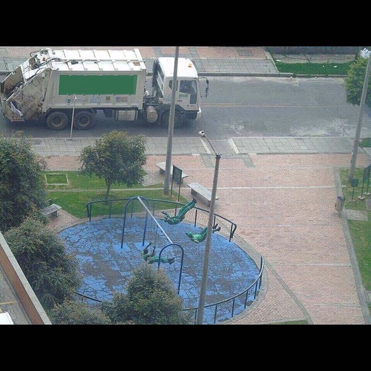 Fotoğrafta, bir çöp kamyonu ve bir oyun alanında salıncakta üç kişi görünüyor. Salıncakta olanlar, kendilerini asıyor gibi görünüyor,...
