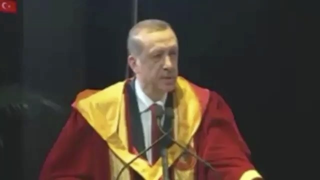 Fotoğrafta Tayyip Erdoğan, kırmızı ve sarı bir cübbe giymiş olarak görülüyor. Erdoğan, bir konuşma yapıyor ve cübbe, bir doktora cübbesi...