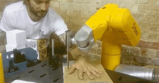 Resimde, sarışın sakallı genç bir adamın elini bir robot kolun üzerine koyduğu görülüyor. Robot kol elin bir kopyasını yapıyor. Şaka şu...