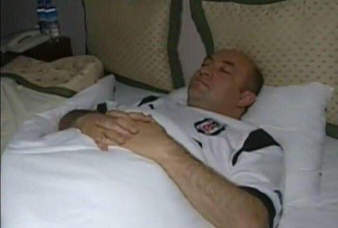 Fotoğrafta, bir futbolcunun yerde yattığı ve bir barbekünün yanında olduğu görülüyor. Yanında "Arena da galibiyet keyfi" yazısı var....