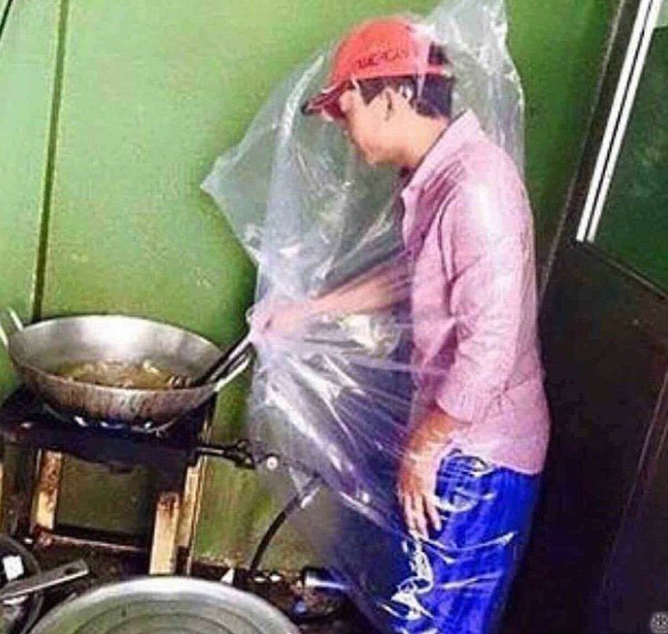 Resimde, bir adam yağda kızartılmış yiyecek pişiriyor, ancak aynı zamanda kendisini yağ sıçramasından korumak için büyük bir plastik...