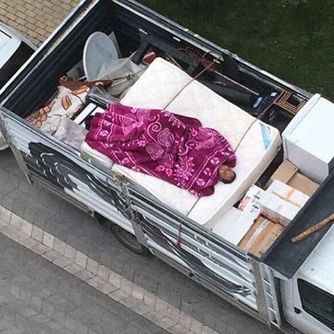 Fotoğrafta, bir kamyonun kasasında yatan bir adamı görüyoruz. Adam, kendini bir battaniyeye sararak, bir yatağın üzerinde rahatça...