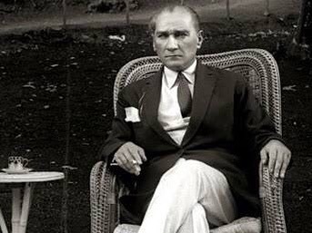 Resimde Mustafa Kemal Atatürk, bir koltukta oturmuş, elinde bir sigara tutuyor. Yanında bir çay bardağı var. Şaka, Atatürk'ün çay...