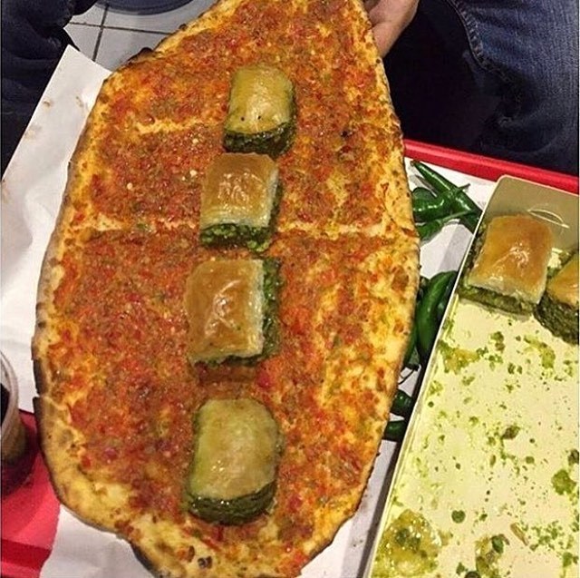 Resimde, üzerine baklava parçaları yerleştirilmiş, üzerine kırmızı sos sürülmüş bir pide görünüyor. Fıkra şu ki, bu, bir pizzaya...