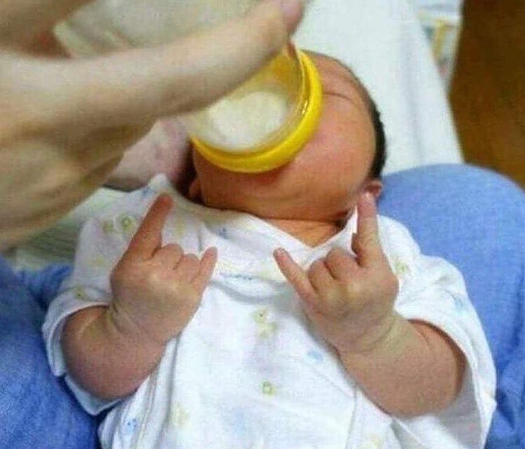 Resimde, bir bebek biberonla besleniyor ve aynı anda rock ve roll işareti yapıyor. Bebeklerin çok küçük yaşlardan itibaren müzikle...