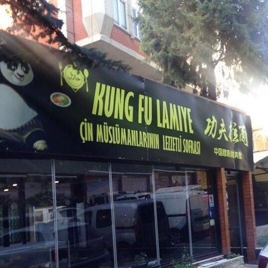 The photo shows a restaurant called "Kung Fu Lamye". The restaurant has a large sign that reads "Çin Müslümanlarının Lezzeti Sofrası"...
