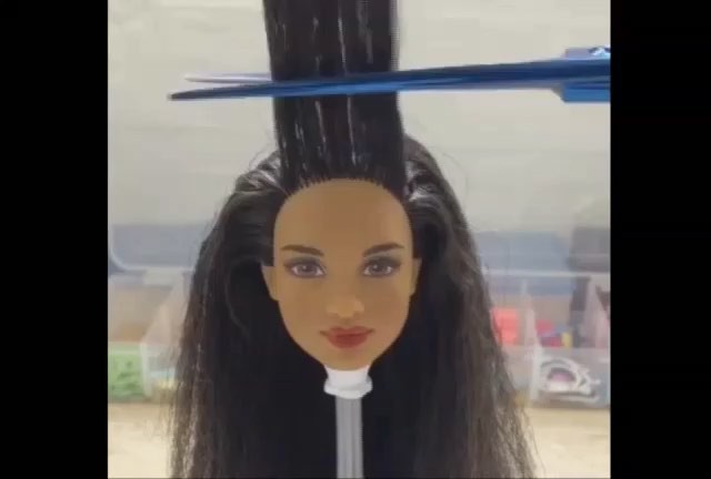 Bu fotoğrafta, saçı kesilmek üzere olan bir Barbie bebek görünüyor. Şaka şu ki, Barbie bebeğin saçları zaten çok kısa ve kesilecek...