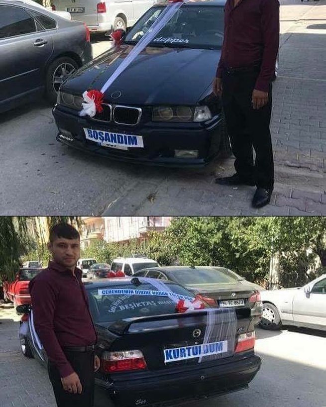 Resimde iki ayrı araba ve yanında duran iki adam var. Her iki arabada da esprili bir şekilde yazılmış etiketler var. İlk araba,...